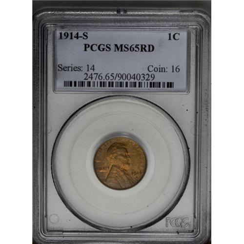 <B>1914-S<1C> MS65 Red PCGS.</B></I> Slightly faded Red on the obverse, brighter on the reverse. The surfaces are clean and lack the abrasions so often encountered on inferior coins. Fully struck on Lincoln's beard, the date and most of the motto, although slight weakness is found on the tops of WE. On the reverse the wheat ears and peripheral lettering are crisp. A scarce date in this lofty grade, with few seen that qualify for the rigorous standards expected for a Gem grade. The early mintmarked Lincoln cents tend to be difficult to find and most present quite a challenge for the Registry collector. The present coin will certainly be on many want lists.<BR> 1914 was a dark time in world history, many countries were swept along as the tides of war inundated Europe. America stayed free of this imbroglio until a few years later. Nevertheless, our economy geared up for the sudden demand for gunpowder, weapons and uniforms. Not many had the foresight to put away these early mintmarked Lincoln cents, and collectors must scour auction catalogs to find just the right example for their sets. Population: 33 in 65, 2 finer (3/06).<BR><I>From The Kendall Marie #4 All-Time Finest PCGS Registry of Lincoln Cents with Varieties, Circulation Strikes, 1909-1958.</B></I> <BR><BR><B>Important notice:</B> Heritage usually auctions material at the rate of 200-250 lots per hour. On some occasions eBay Live bid software or the Internet may not be able to keep up with the pace of the auction. We recommend placing a realistic absentee bid now as insurance to avoid disappointment. Occasionally the auctioneer may eliminate or reject an eBay Live bid, and the auctioneer may also reopen a lot after the close of the eBay live bidding (usually because we missed an audience bid), and may reject your bid even if it shows you as the winning bidder. By bidding via eBay Live, you agree that Heritage may award the lot to another bidder at its sole discretion under the circumstances described above or any other reasonable circumstances. Since eBay bids are not shown to us until we open the lot on the floor, we treat those bids just like floor bids. In most cases the floor responds before the eBay bid is presented to us, due to Internet lag time, so for consistency we have made it a policy that floor bids are always considered first over tie eBay live bids. Also please note that all Heritage lots purchased through eBay Live carry a 20% Buyer's Premium. Please make sure you read the Terms and Conditions before you bid. This lot is being auctioned in conjunction with a live floor auction by Heritage Galleries & Auctioneers. All final auction and invoice information will be supplied by Heritage Galleries & Auctioneers, and all other information should be considered preliminary. Lot:483 <BR><BR><B>Winning Notification and Billing:</B> After the FINAL session in this auction is complete, Heritage will send e-mail and snail mail invoices. This process normally takes several days. All final auction and invoice information will be supplied by Heritage Galleries & Auctioneers, and all other information should be considered preliminary. <BR><BR>This auction will be conducted on a live auction floor and over the Internet through eBay Live. If you choose to place an absentee bid, please take a moment to <font color='#0000ff'><u><a href='http://pages.ebay.com/liveauctions/help/before/laabsentee.html'>learn how eBay Live absentee bidding works</a></u></font><font color='#000000'>
