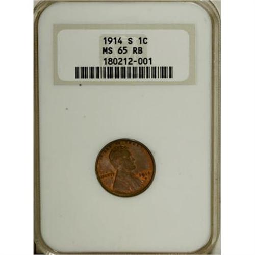 <B>1914-S 1C MS65 Red and Brown NGC.</B></I> Both sides exhibit orange-red, although steel-brown and aqua are also present. Scintillating luster shimmers across the unmarked fields and devices. Minute flyspecks emerge beneath a loupe. In a prior generation holder.<BR><BR><B>Coin Engraver:</B> Victor D. Brenner<BR><BR><b>Shipping:</b> Coins & Currency (<a target="_blank" href="http://www.heritageauctions.com/common/shipping.php">view shipping information</a>)