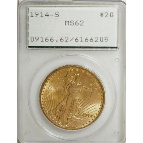 <B>1914-S $20 MS62 PCGS.</B></I> PCGS Population (3234/9986). NGC Census: (3386/13148). Mintage: 1,498,000. Numismedia Wsl. Price for NGC/PCGS coin in MS62: $895. (#9166)<BR><BR><B>Coin Engraver:</B> Augustus Saint-Gaudens<BR><BR><b>Shipping:</b> Coins & Currency (<a target="_blank" href="http://www.heritageauctions.com/common/shipping.php">view shipping information</a>)