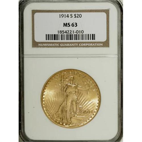 <B>1914-S $20 MS63 NGC.</B></I> NGC Census: (6403/6391). PCGS Population (4204/4429). Mintage: 1,498,000. Numismedia Wsl. Price for NGC/PCGS coin in MS63: $780. (#9166)<BR><BR><b>Shipping:</b> Coins & Currency (<a target="_blank" href="http://www.heritageauctions.com/common/shipping.php">view shipping information</a>)