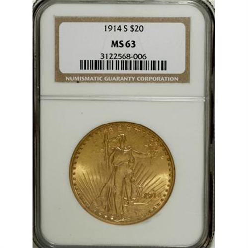 <B>1914-S $20 MS63 NGC.</B></I> NGC Census: (6569/6564). PCGS Population (4453/5477). Mintage: 1,498,000. Numismedia Wsl. Price for NGC/PCGS coin in MS63: $935. (#9166)<BR><BR><B>Coin Engraver:</B> Augustus Saint-Gaudens<BR><BR><b>Shipping:</b> Coins & Currency (<a target="_blank" href="http://www.heritageauctions.com/common/shipping.php">view shipping information</a>)