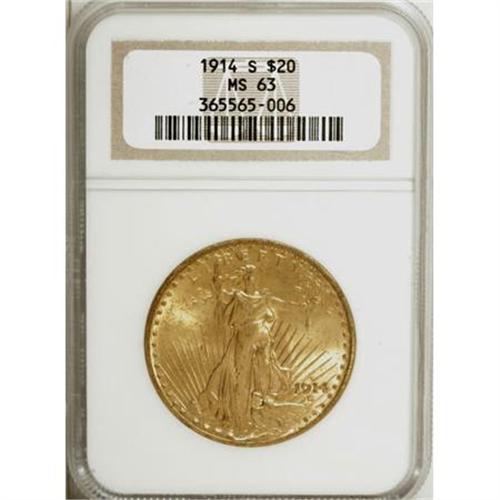 <B>1914-S $20 MS63 NGC.</B></I> NGC Census: (6575/6573). PCGS Population (4462/5524). Mintage: 1,498,000. Numismedia Wsl. Price for NGC/PCGS coin in MS63: $935. (#9166)<BR><BR><B>Coin Engraver:</B> Augustus Saint-Gaudens<BR><BR><b>Shipping:</b> Coins & Currency (<a target="_blank" href="http://www.heritageauctions.com/common/shipping.php">view shipping information</a>)