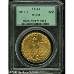 <B>1914-S $20 MS63 PCGS.</B></I> As one would expect from the grade with even gold color throughout. Interestingly, a slight clockwise rotation is seen on the reverse surfaces. Lot:9558