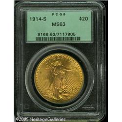 <B>1914-S $20 MS63 PCGS.</B></I> Coruscant luster dominates the eye appeal of this orange-gold piece. Lot:9557