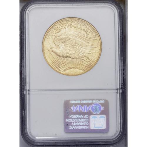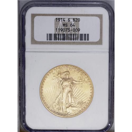 <B>1914-S<$20> MS64 NGC.</B></I> Sharply struck and thoroughly lustrous with bright sunrise-gold color and a particularly clean reverse. <BR><BR><B>Important notice:</B> Heritage usually auctions material at the rate of 200-250 lots per hour. On some occasions eBay Live bid software or the Internet may not be able to keep up with the pace of the auction. We recommend placing a realistic absentee bid now as insurance to avoid disappointment. Occasionally the auctioneer may eliminate or reject an eBay Live bid, and the auctioneer may also reopen a lot after the close of the eBay live bidding (usually because we missed an audience bid), and may reject your bid even if it shows you as the winning bidder. By bidding via eBay Live, you agree that Heritage may award the lot to another bidder at its sole discretion under the circumstances described above or any other reasonable circumstances. Since eBay bids are not shown to us until we open the lot on the floor, we treat those bids just like floor bids. In most cases the floor responds before the eBay bid is presented to us, due to Internet lag time, so for consistency we have made it a policy that floor bids are always considered first over tie eBay live bids. Also please note that all Heritage lots purchased through eBay Live carry a 20% Buyer's Premium. Please make sure you read the Terms and Conditions before you bid. This lot is being auctioned in conjunction with a live floor auction by Heritage Galleries & Auctioneers. All final auction and invoice information will be supplied by Heritage Galleries & Auctioneers, and all other information should be considered preliminary. Lot:4642 <BR><BR><B>Winning Notification and Billing:</B> After the FINAL session in this auction is complete, Heritage will send e-mail and snail mail invoices. This process normally takes several days. All final auction and invoice information will be supplied by Heritage Galleries & Auctioneers, and all other information should be considered preliminary. <BR><BR>This auction will be conducted on a live auction floor and over the Internet through eBay Live. If you choose to place an absentee bid, please take a moment to <font color='#0000ff'><u><a href='http://pages.ebay.com/liveauctions/help/before/laabsentee.html'>learn how eBay Live absentee bidding works</a></u></font><font color='#000000'>