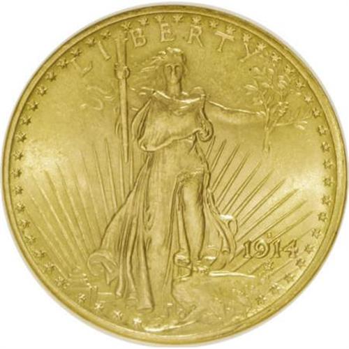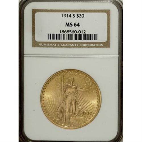 <B>1914-S $20 MS64 NGC.</B></I> NGC Census: (5094/1404). PCGS Population (3716/1669). Mintage: 1,498,000. Numismedia Wsl. Price for NGC/PCGS coin in MS64: $900. (#9166)<BR><BR><B>Coin Engraver:</B> Augustus Saint-Gaudens<BR><BR><b>Shipping:</b> Coins & Currency (<a target="_blank" href="http://www.heritageauctions.com/common/shipping.php">view shipping information</a>)