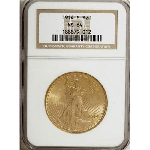 <B>1914-S $20 MS64 NGC.</B></I> NGC Census: (5142/1431). PCGS Population (3806/1718). Mintage: 1,498,000. Numismedia Wsl. Price for NGC/PCGS coin in MS64: $1,060. (#9166)<BR><BR><B>Coin Engraver:</B> Augustus Saint-Gaudens<BR><BR><b>Shipping:</b> Coins & Currency (<a target="_blank" href="http://www.heritageauctions.com/common/shipping.php">view shipping information</a>)