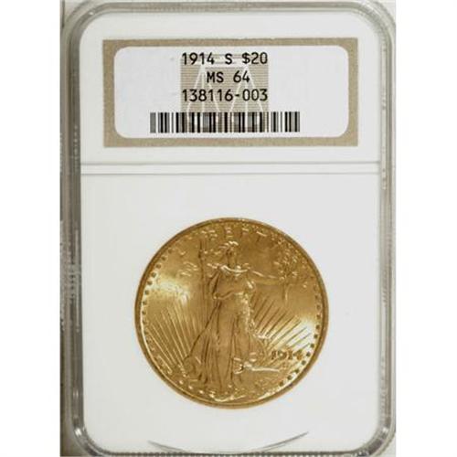 <B>1914-S $20 MS64 NGC.</B></I> NGC Census: (5142/1431). PCGS Population (3806/1718). Mintage: 1,498,000. Numismedia Wsl. Price for NGC/PCGS coin in MS64: $1,060. (#9166)<BR><BR><B>Coin Engraver:</B> Augustus Saint-Gaudens<BR><BR><b>Shipping:</b> Coins & Currency (<a target="_blank" href="http://www.heritageauctions.com/common/shipping.php">view shipping information</a>)
