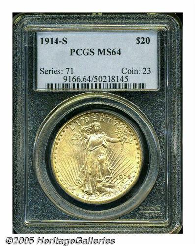 <B>1914-S<$20> MS64 PCGS.</B></I> Sharply struck with bright, satiny, matte-like surfaces and a handful of small yet grade-restricting marks on the obverse, that probably kept the piece from a Gem holder.