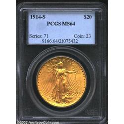 1914-S $20 MS64 PCGS. Well preserved aside from a faint abrasion to the left of Liberty's torch. Boldly struck except for the 4 in the date. A lustrous near-Gem with rich lemon-butter patina. Important notice: We expect to be auctioning lots at the rate of 200-250 per hour. Sometimes eBay Premier live bid software cannot keep up with that pace, so we strongly recommend that you place a realistic proxy bid now as insurance to avoid disappointment. Also please note that all Heritage/CAA lots purchased through eBay Premier carry a 20% Buyer's Premium. Please make sure you read the Terms and Conditions.