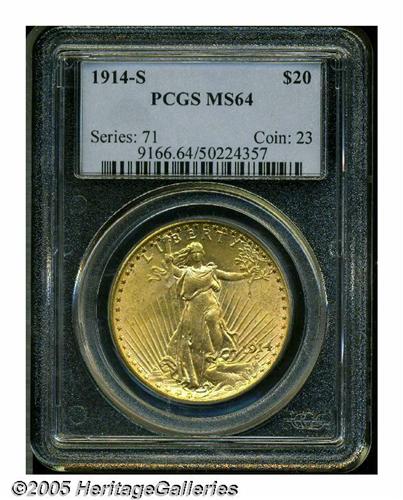 <B>1914-S<$20> MS64 PCGS.</B></I> Well struck with a few minor abrasions, the granular surfaces display a satiny overlay of mint luster.