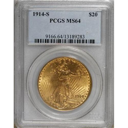 <B>1914-S $20 MS64 PCGS.</B></I> PCGS Population (3409/1517). NGC Census: (5040/1383). Mintage: 1,498,000. Numismedia Wsl. Price for NGC/PCGS coin in MS64: $860. (#9166)<BR><BR><B>Coin Engraver:</B> Augustus Saint-Gaudens<BR><BR><b>Shipping:</b> Coins & Currency (<a target="_blank" href="http://www.heritageauctions.com/common/shipping.php">view shipping information</a>\)