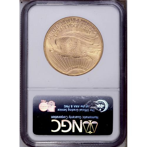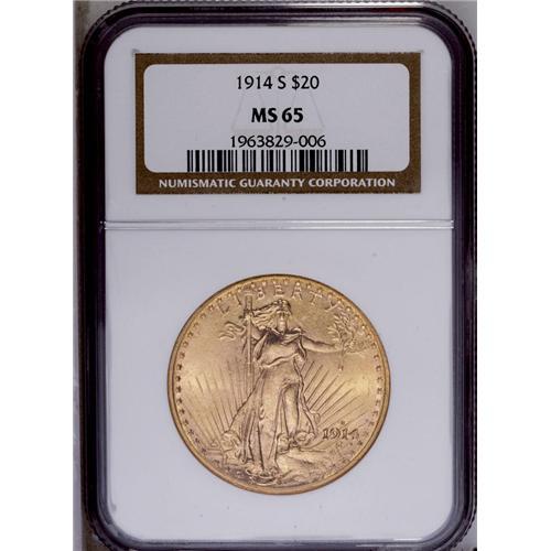 <B>1914-S<$20> MS65 NGC.</B></I> Both sides exhibit the soft frosted luster characteristic of the issue and show minimal disturbances over boldly struck surfaces.