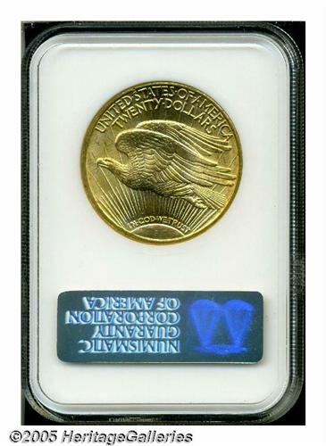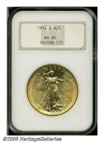 <B>1914-S<$20> MS65 NGC.</B></I> Bright peach-gold surfaces with wisps of darker gold color display dazzling luster over each side. All of the design features are crisply impressed. A few minor marks on Liberty's legs and midsection are mentioned for accuracy. NGC has certified 54 specimens finer (4/05).<BR><I>From The Clifford Columbus Collection.</B></I>