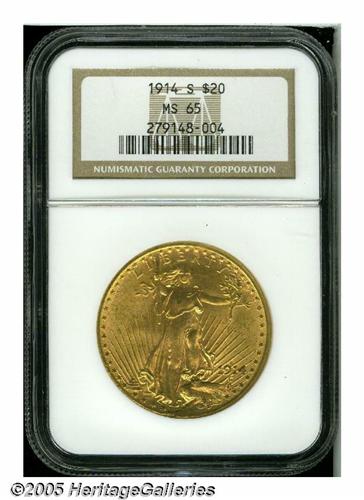 1914-S $20 MS65 NGC. Sharply struck with bright,