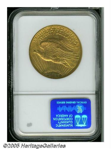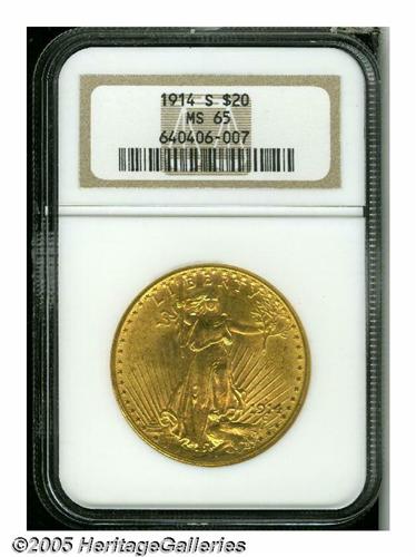 <B>1914-S<$20> MS65 NGC.</B></I> Sharply struck with bright, lustrous surfaces and rich orange-gold color. A couple of small marks on each of liberty's legs are mentioned for accuracy. A very appealing coin that is scarce any finer; NGC has certified 59 pieces in higher grades (6/05).