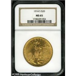 <B>1914-S $20 MS65 NGC.</B></I> Sharply struck with luminous surfaces that glow with rich mint frost. A very attractive Gem with no observable marks. Lot:9565
