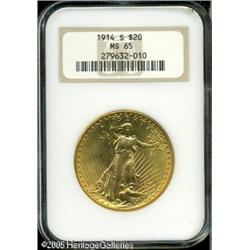 <B>1914-S $20 MS65 NGC.</B></I> Strong luster and bright apricot-gold patination. The design elements are sharply struck up, and the well preserved surfaces are devoid of any significant marks. Lot:9566
