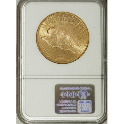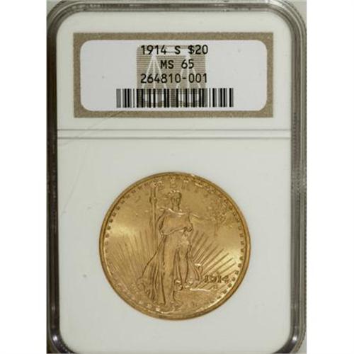 <B>1914-S $20 MS65 NGC.</B></I> Intense luster radiates from peach-gold surfaces that exhibit sharply impressed design features, including excellent delineation on Liberty's hand and foot and the eagle's plumage. A few minute marks do not detract in the least. A great high-grade type coin from this readily available issue.<BR><BR><b>Shipping:</b> Coins & Currency (<a target="_blank" href="http://www.heritageauctions.com/common/shipping.php">view shipping information</a>)