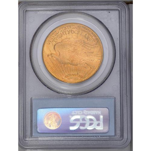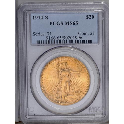 <B>1914-S<$20> MS65 PCGS.</B></I> A great lemon-yellow Gem with slightly satiny texture to the fields. The figure of Liberty is nicely detailed, even on the hand and toes.