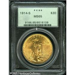 <B>1914-S $20 MS65 PCGS.</B></I> A splendid Gem example of this popular S-mint. The surfaces show exceptional frosted mint luster and the matte-like granularity common to this issue is barely noticeable on this piece. Reddish patina. Lot:9564