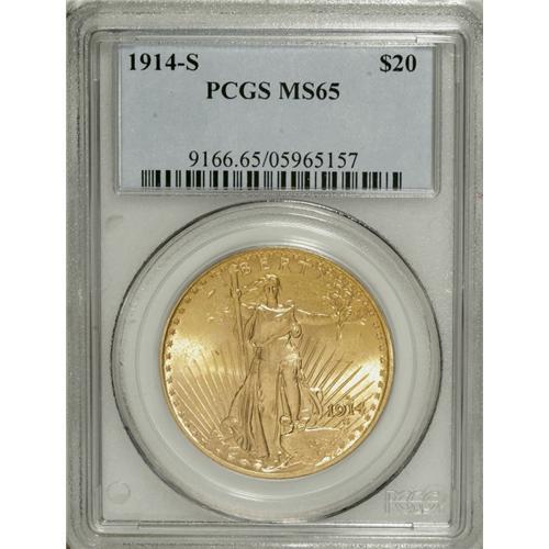 1914-S $20 MS65 PCGS. The bright, finely grained surfa