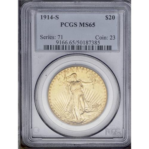 <B>1914-S<$20> MS65 PCGS.</B></I> The sparkling luster is the first attribute one notices on this lovely Gem piece, which offers a crisp strike over luscious honey-gold surfaces. The few abrasions noted are mostly limited to a small patch in the right (facing) obverse field. PCGS has graded 57 examples finer (4/06).