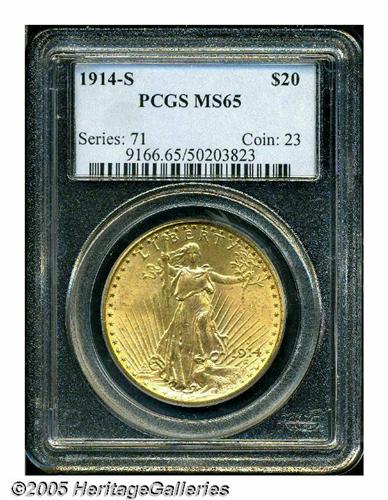 <B>1914-S<$20> MS65 PCGS.</B></I> Well struck with bright satiny luster, enticing red-gold color, and a handful of wispy contact marks, on each side of the coin. The '14-S Double Eagle is common through the MS64 grade level, but becomes relatively scarce as a full Gem.