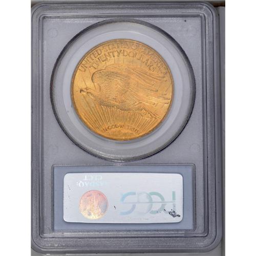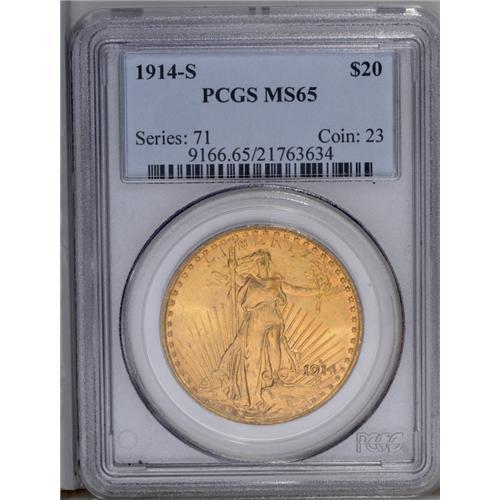 <B>1914-S<$20> MS65 PCGS.</B></I> Yellow-gold with a faint orange cast to the lustrous surfaces. Generally boldly struck, though the typical trouble spots lack some detail.