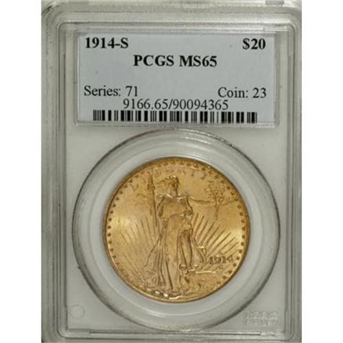 <B>1914-S $20 MS65 PCGS.</B></I> Lovely sun-gold and canary shades converge on this delightful S-mint double eagle. Powerful luster enhances the visual appeal of the carefully preserved surfaces.<BR><BR><B>Coin Engraver:</B> Augustus Saint-Gaudens<BR><BR><b>Shipping:</b> Coins & Currency (<a target="_blank" href="http://www.heritageauctions.com/common/shipping.php">view shipping information</a>)