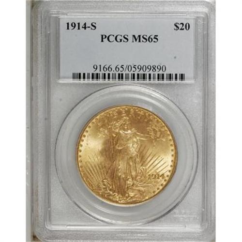 <B>1914-S $20 MS65 PCGS.</B></I> This well struck and slightly satiny S-mint Gem shows primarily wheat-gold surfaces that show areas of yellow-orange at the lower obverse. A visually interesting example for the issue.<BR><BR><B>Coin Engraver:</B> Augustus Saint-Gaudens<BR><BR><b>Shipping:</b> Coins & Currency (<a target="_blank" href="http://www.heritageauctions.com/common/shipping.php">view shipping information</a>)