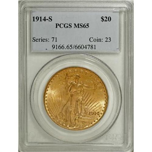 <B>1914-S $20 MS65 PCGS.</B></I> PCGS Population (1604/89). NGC Census: (1312/97). Mintage: 1,498,000. Numismedia Wsl. Price for NGC/PCGS coin in MS65: $1,500. (#9166)<BR><BR><B>Coin Engraver:</B> Augustus Saint-Gaudens<BR><BR><b>Shipping:</b> Coins & Currency (<a target="_blank" href="http://www.heritageauctions.com/common/shipping.php">view shipping information</a>)