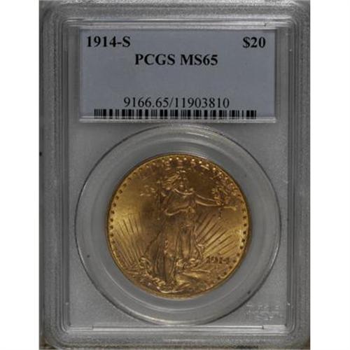 <B>1914-S $20 MS65 PCGS.</B></I> NGC Census: (1343/97). PCGS Population (1691/91). Mintage: 1,498,000. Numismedia Wsl. Price for NGC/PCGS coin in MS65: $1,625. (#9166)<BR><BR><B>Coin Engraver:</B> Augustus Saint-Gaudens<BR><BR><b>Shipping:</b> Coins & Currency (<a target="_blank" href="http://www.heritageauctions.com/common/shipping.php">view shipping information</a>)