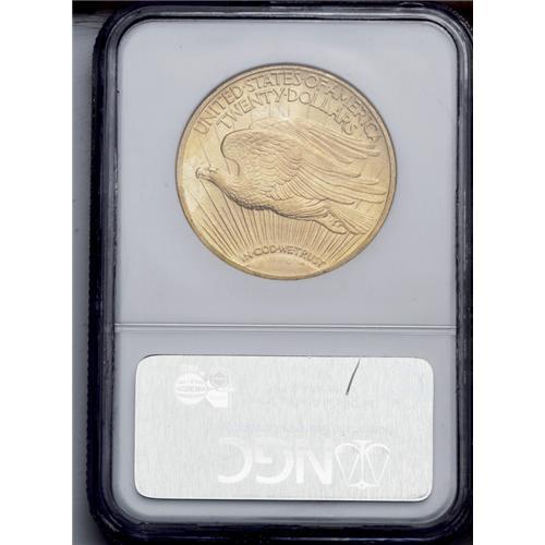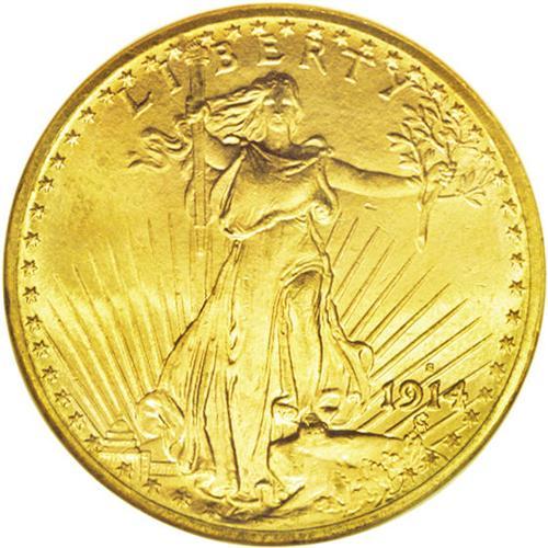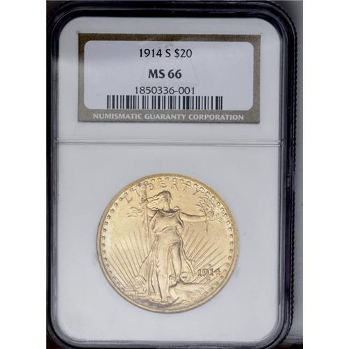 <B>1914-S<$20> MS66 NGC.</B></I> A sharply struck Premium Gem with frosty yellow-gold luster and excellent eye appeal. A few minute surface marks on each side keep this out of the Superb Gem grade range. Although the date is a relatively common one, no finer examples have been certified by either NGC or PCGS. Census: 80 in 66, 0 finer (6/06).