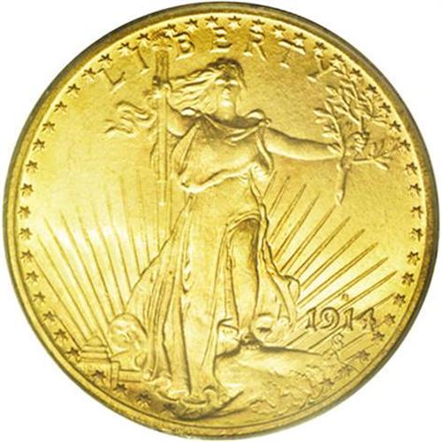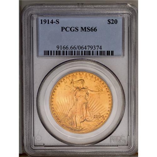<B>1914-S<$20> MS66 PCGS.</B></I> Rich yellow-gold luster with splashes of orange color on both sides. The surfaces are lightly bagmarked as usual for these large gold coins, even at this grade level. This date is an excellent candidate for the type collector as it is considered a common issue, yet it is clearly rarer than the most common dates of the 1920s.