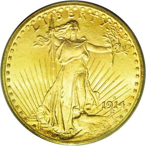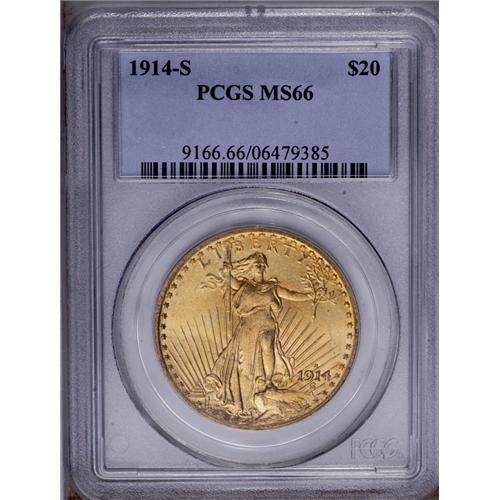 <B>1914-S<$20> MS66 PCGS.</B></I> This example is tied for the finest example of the date certified by PCGS or NGC. It is sharply struck and possesses scintillating yellow-gold luster with soft, frosty surfaces. Population: 60 in 66, 0 finer (6/06).