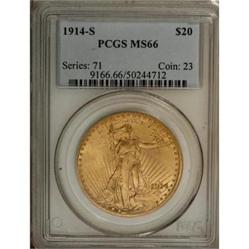 <B>1914-S $20 MS66 PCGS.</B></I> Luscious golden color graces richly textured surfaces that are unabraded by the many contact marks or imperfections that are generally seen on larger coins like this. The strike is unusually bold and the fields glow with the confidence of a winner. While at almost 1.5 million pieces, the mintage of this issue was by no means small, high-end survivors are rare and neither PCGS nor NGC have graded a finer example than this one. Certainly worth a close examination and a strong bid by a connoisseur with an eye for quality and a taste for rarity. <BR><I>From The Jacob Collection of Saint-Gaudens Double Eagles.</B></I><BR><BR><B>Coin Engraver:</B> Augustus Saint-Gaudens<BR><BR><b>Shipping:</b> Coins & Currency (<a target="_blank" href="http://www.heritageauctions.com/common/shipping.php">view shipping information</a>)