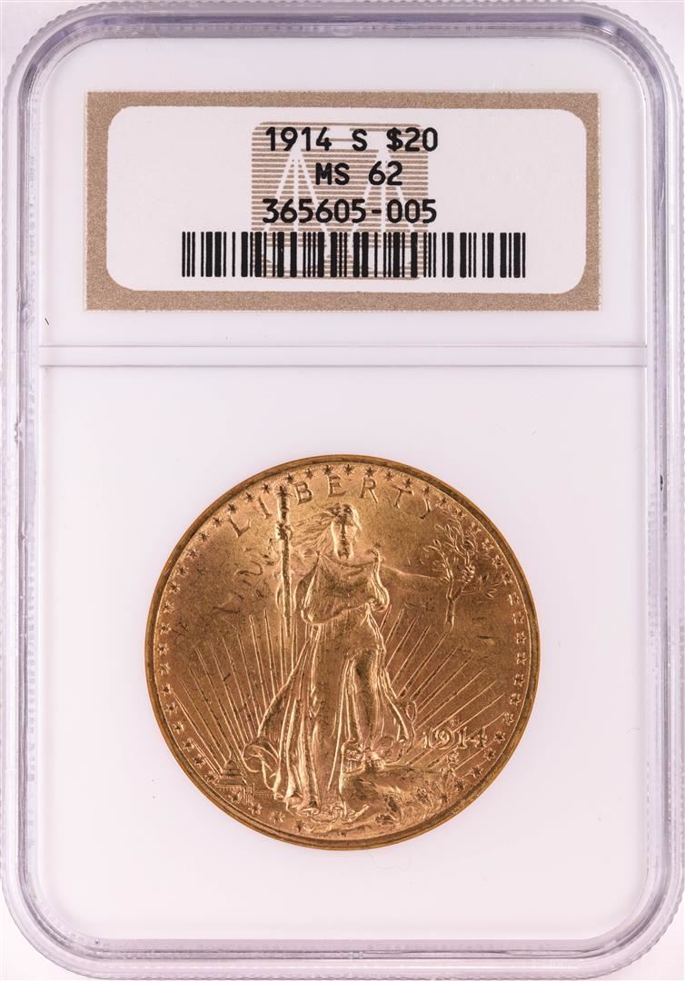 One 1914-S $20 St. Gaudens Double Eagle Gold Coin NGC MS62. NGC Certified.