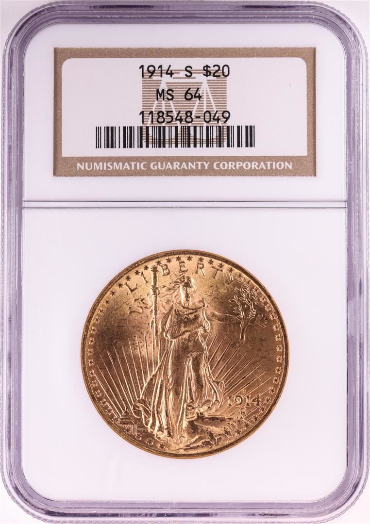 One 1914-S $20 St. Gaudens Double Eagle Gold Coin NGC MS64. NGC Certified.