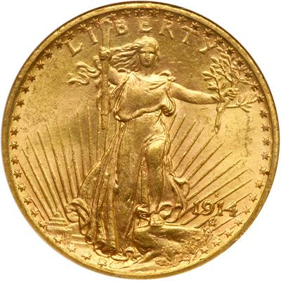 1914-S $20 St. Gaudens. NGC graded MS-63. Softly toned. This sparkling MS63 boasts swirling luster effects and uncommonly sharp striking detail for being an S-mint issue (PCGS # 9166) .