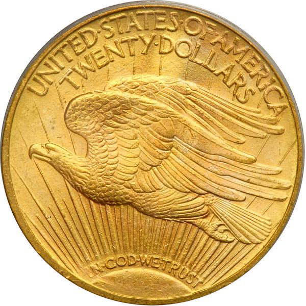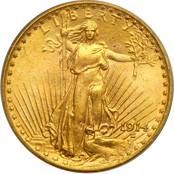 1914-S $20 St. Gaudens. PCGS graded MS-65. Nice rich golden colors mixed in with satiny jewel surfaces of the true Gem. All this is perhaps exemplary, but also, the coin displays satisfactory detail from a first-class strike, including the important inner areas where a weak strike can lower the grade by a point or more. Pop 1,835; 102 finer (PCGS # 9166) .