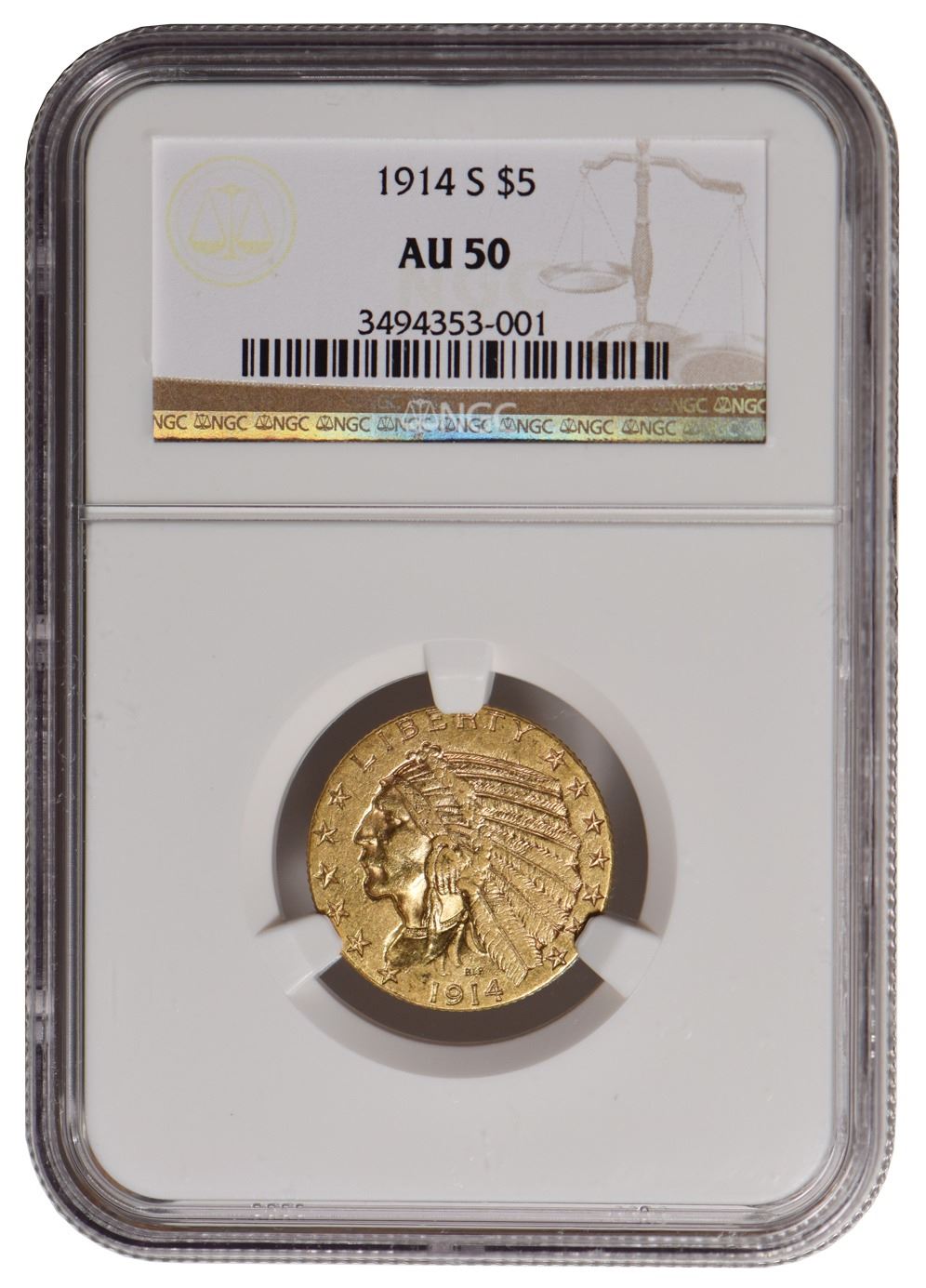 One 1914-S $5 Indian Head Half Eagle Gold Coin NGC AU50.