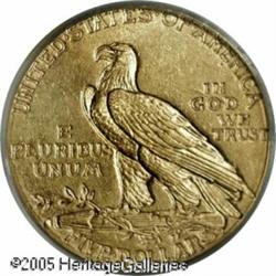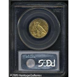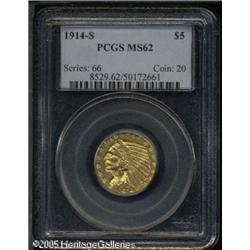 <B>1914-S $5 MS62 PCGS.</B></I> Bright yellow-gold in color and attractive for the grade. The surfaces show scattered handling marks, but none are deep or distracting. About as nice as this date is found, with a handful seen finer, and a cluster of mint state examples tied with the present coin. One for the date collector who appreciates a decent strike and good eye appeal. Population: 136 in 62, 22 finer (1/05). Lot:8706