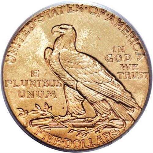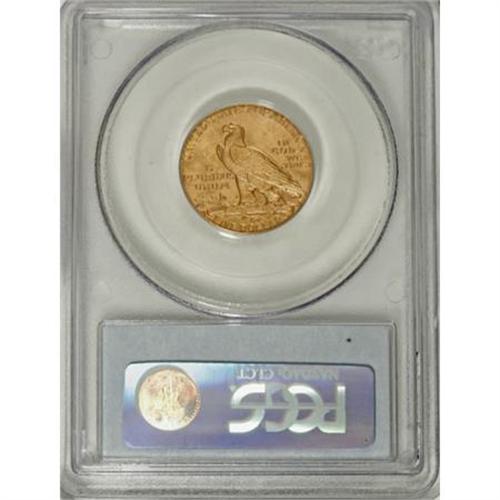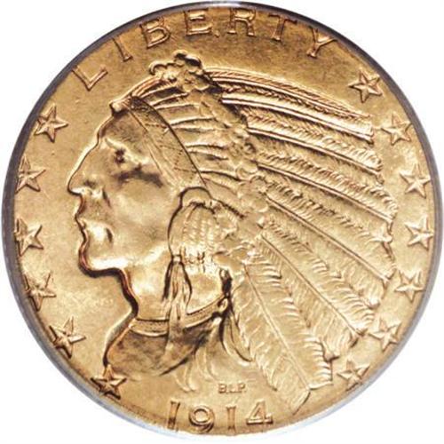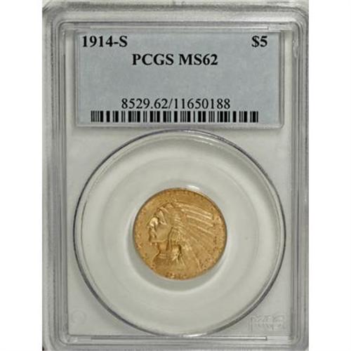 <B>1914-S $5 MS62 PCGS.</B></I> Boldly impressed with strong luster and attractive straw-gold surfaces with glints of wheat and apricot. Light, scattered abrasions preclude a finer grade. The 1914-S, a lower-mintage issue for the Indian half eagle series, is challenging in MS62 and a condition rarity in Select or better grades, with just 23 such pieces certified by PCGS (7/07).<BR><BR><B>Coin Engraver:</B> Bela Lyon Pratt<BR><BR><b>Shipping:</b> Coins & Currency (<a target="_blank" href="http://www.heritageauctions.com/common/shipping.php">view shipping information</a>\)