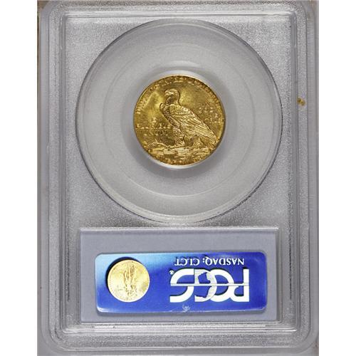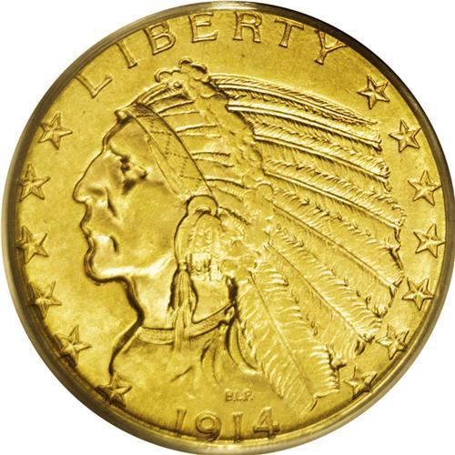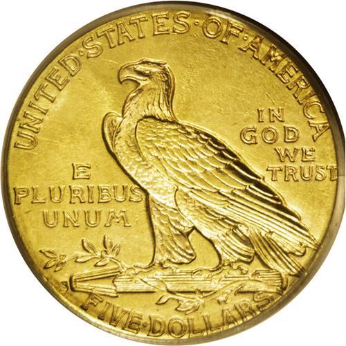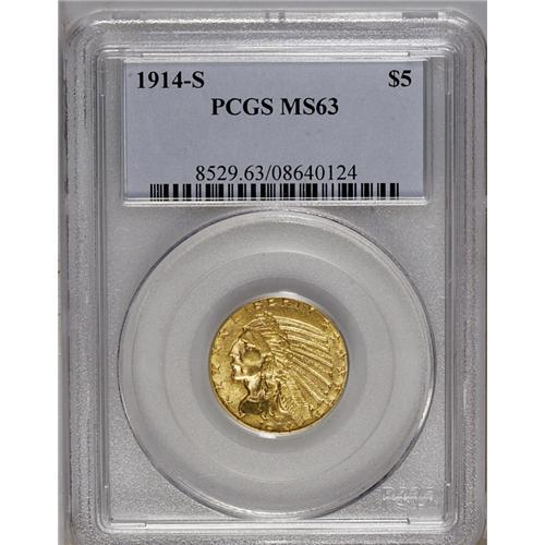 <B>1914-S<$5> MS63 PCGS.</B></I> Although several hundred survivors of this issue exist today in the lower Uncirculated grades, this issue becomes quite rarefied at the MS63 level, and is nearly impossible to find in MS64 or higher. This pretty piece boasts greenish-gold surfaces, with soft luster. Even under a loupe, only a few light, scattered minuscule field abrasions are noted. The Indian's cheek is exceptionally clean,. despite a couple of ticks in the exposed fields before the face. The reverse is high-end for the grade. PCGS has graded only 16 pieces in MS63, with seven coins finer (7/06).