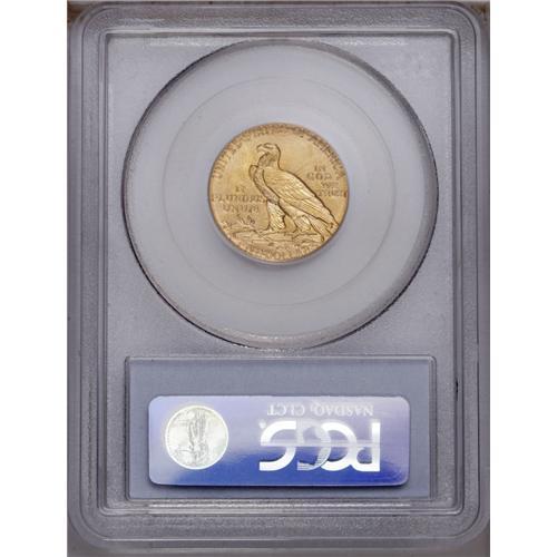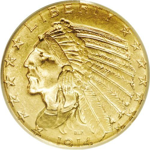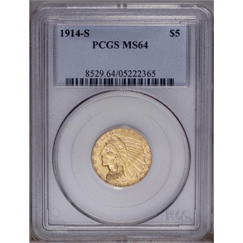 <B>1914-S<$5> MS64 PCGS.</B></I> A nearly impossible issue to locate at the MS64 grade level and essentially unknown as a true Gem. The 1914-S is the only contender capable of taking on the 1911-D half eagle for top rarity honors among 20th century gold issues. This specimen displays hallmark gritty surfaces and bright, frosty luster. The rustic nature of the faces, however, is beneficial in that it masks the few wispy bagmarks that account for the grade. The mintmark is clearly definable but the overall strike is average. The eye appeal is, however, quite attractive for the issue and has a decided antique copper-gold aspect. PCGS has encapsulated six examples in MS64 with none finer, although NGC reports a lone MS65 example (1/06).
