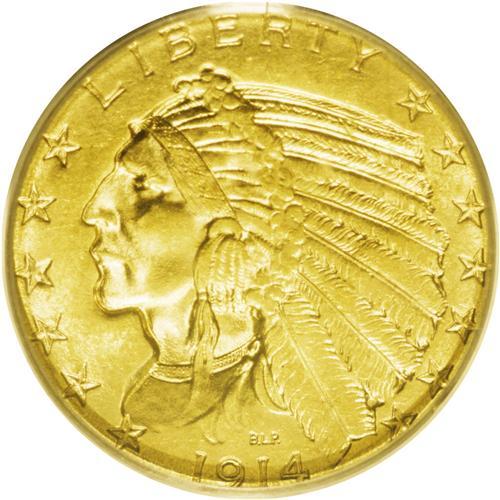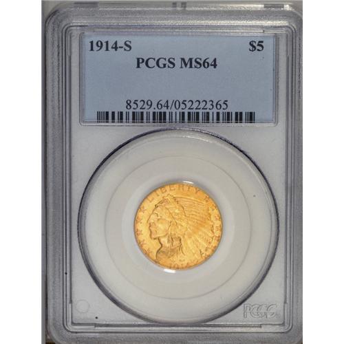 <B>1914-S<$5> MS64 PCGS.</B></I> The 1914-S five dollar is a nearly impossible issue to locate at the MS64 grade level and essentially unknown as a true Gem. The '14-S is the only contender capable of taking on the 1911-D half eagle for top rarity honors among 20th century gold issues. This specimen displays hallmark gritty surfaces and bright, frosty luster. The rustic nature of the faces, however, is beneficial in that it masks the few wispy bagmarks that account for the grade. The mintmark is clearly discernible and the overall strike is above average. The eye appeal is, however, quite attractive for the issue and has a decided antique copper-gold aspect. Any U.S. gold specialist should pay close attention to this seldom-seen offering. PCGS has encapsulated seven examples in MS64 with none finer, although NGC reports a lone MS65 example (7/06).