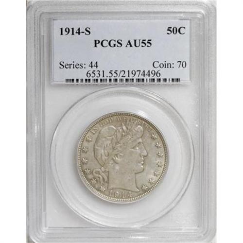 <B>1914-S 50C AU55 PCGS.</B></I> A satiny, briefly circulated Choice AU example of this low-mintage San Francisco issue, primarily silver-gray with deep reddish-orange at the obverse margins and in a streak above the eagle's head. Minimally marked and pleasing.<BR><BR><B>Coin Engraver:</B> Charles E. Barber<BR><BR><b>Shipping:</b> Coins & Currency (<a target="_blank" href="http://www.heritageauctions.com/common/shipping.php">view shipping information</a>)