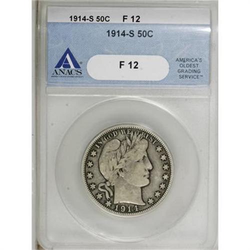 <B>1914-S 50C F12 ANACS.</B></I> . NGC Census: (2/88). PCGS Population (2/150). Mintage: 992,000. Numismedia Wsl. Price for NGC/PCGS coin in F12: $33. (#6531)<BR><BR><B>Coin Engraver:</B> Charles E. Barber<BR><BR><b>Shipping:</b> Coins & Currency (<a target="_blank" href="http://www.heritageauctions.com/common/shipping.php">view shipping information</a>)