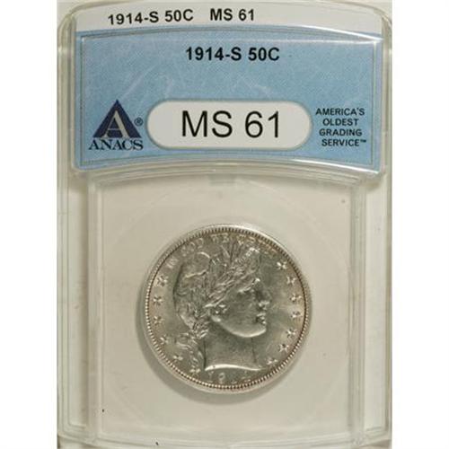 <B>1914-S 50C MS61 ANACS.</B></I> Tinges of gold and ice-blue grace the strongly lustrous, subtly reflective surfaces of this later-date Barber half, a low-mintage issue along with the 1914-P. Well struck with a number of wispy marks present in the fields.<BR><BR><b>Shipping:</b> Coins & Currency (<a target="_blank" href="http://www.heritageauctions.com/common/shipping.php">view shipping information</a>)